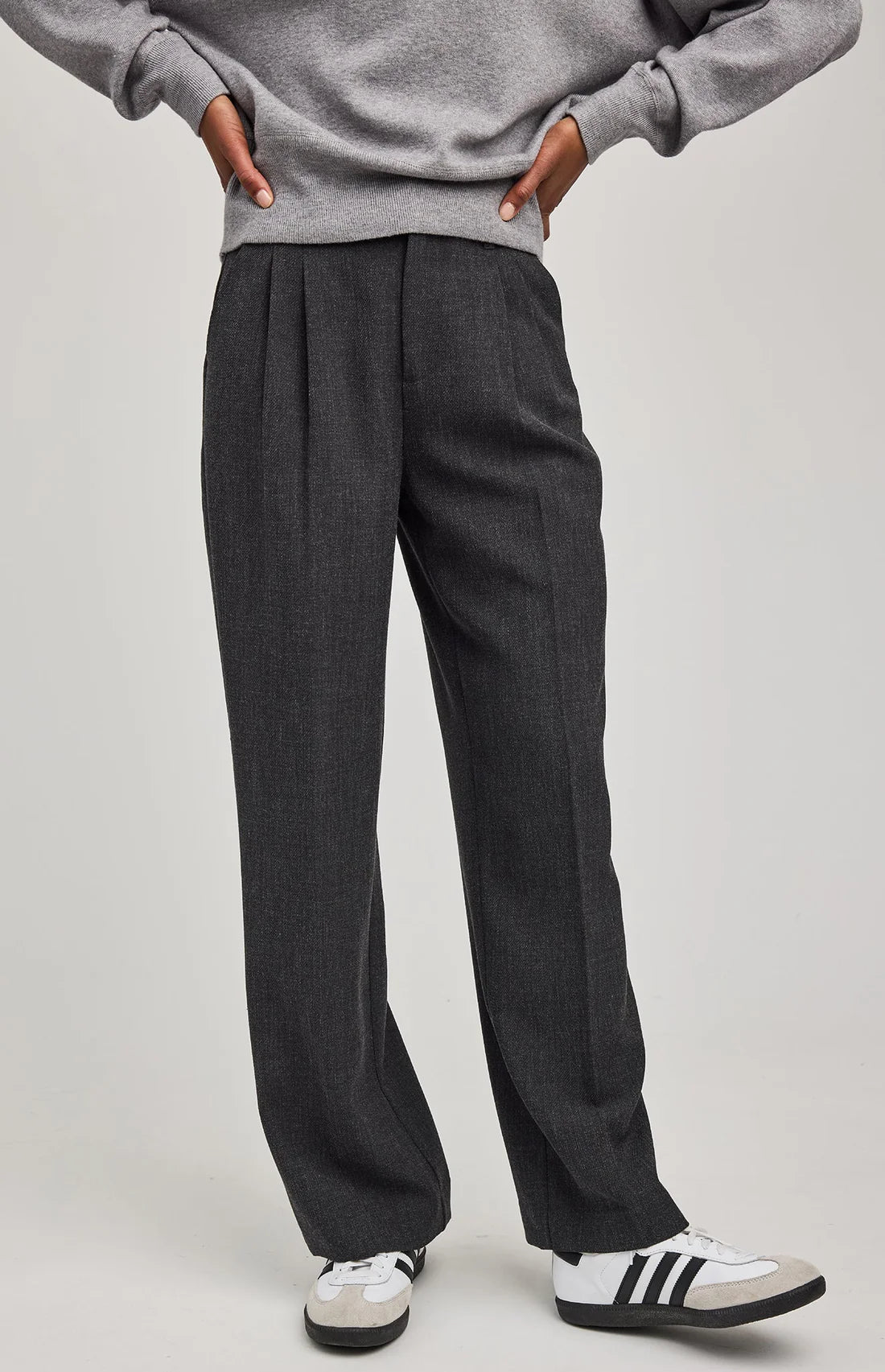 Made of a heathered twill suiting fabric, the Trina is an effortless trouser pant silhouette designed for everyday wear. Features include side seam pockets, front pleats, and back waist darts for a perfectly tailored look. Complete the look with the Jeanie blazer.