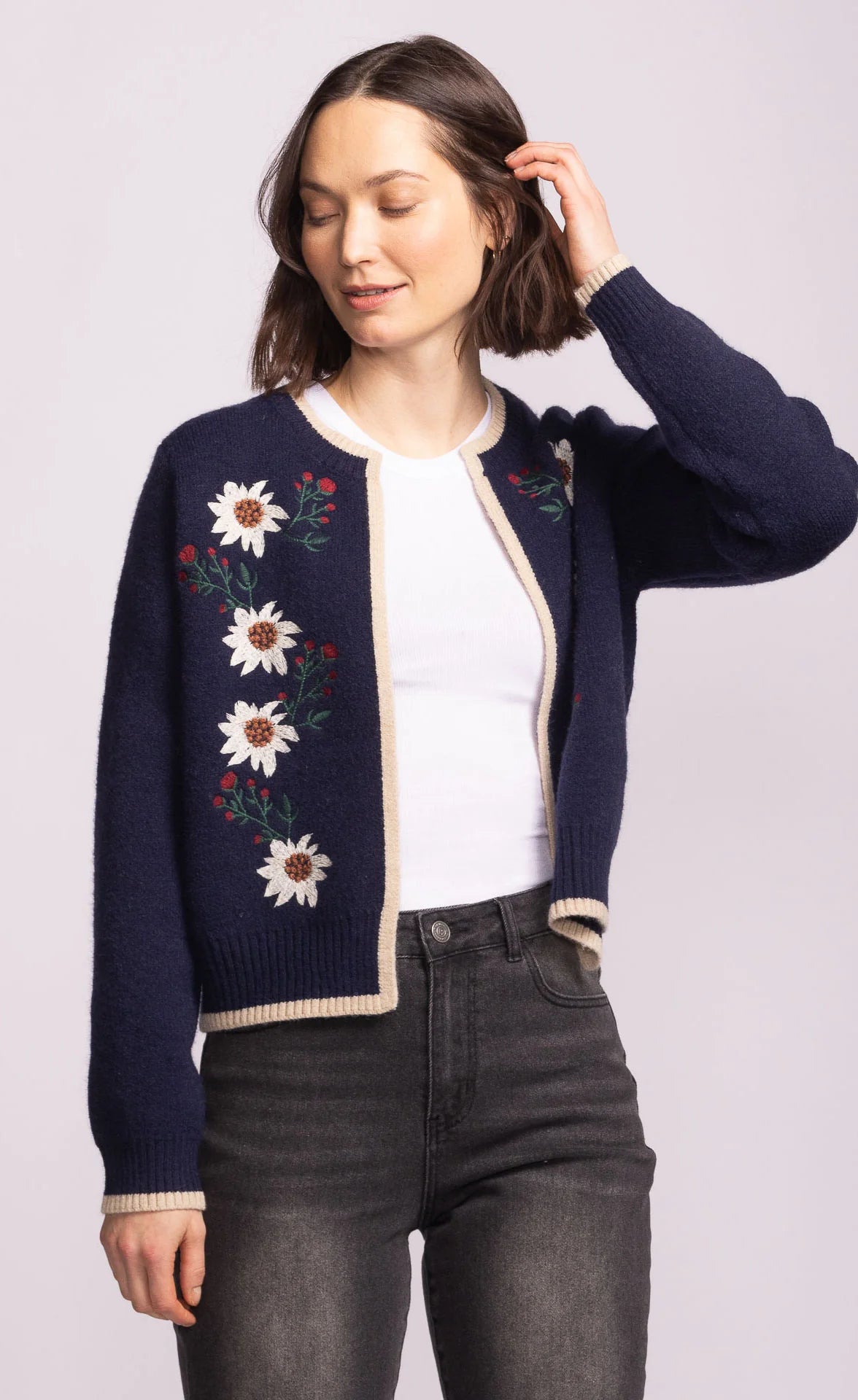 The Hermosa Sweater is a knit sweater cardigan with delicate floral embroidery and contrast trims, designed to keep you chic and cozy. This embroidered cardigan is perfect for layering over a basic top and pairs effortlessly with jeans, trousers, or skirts for an elevated casual outfit.