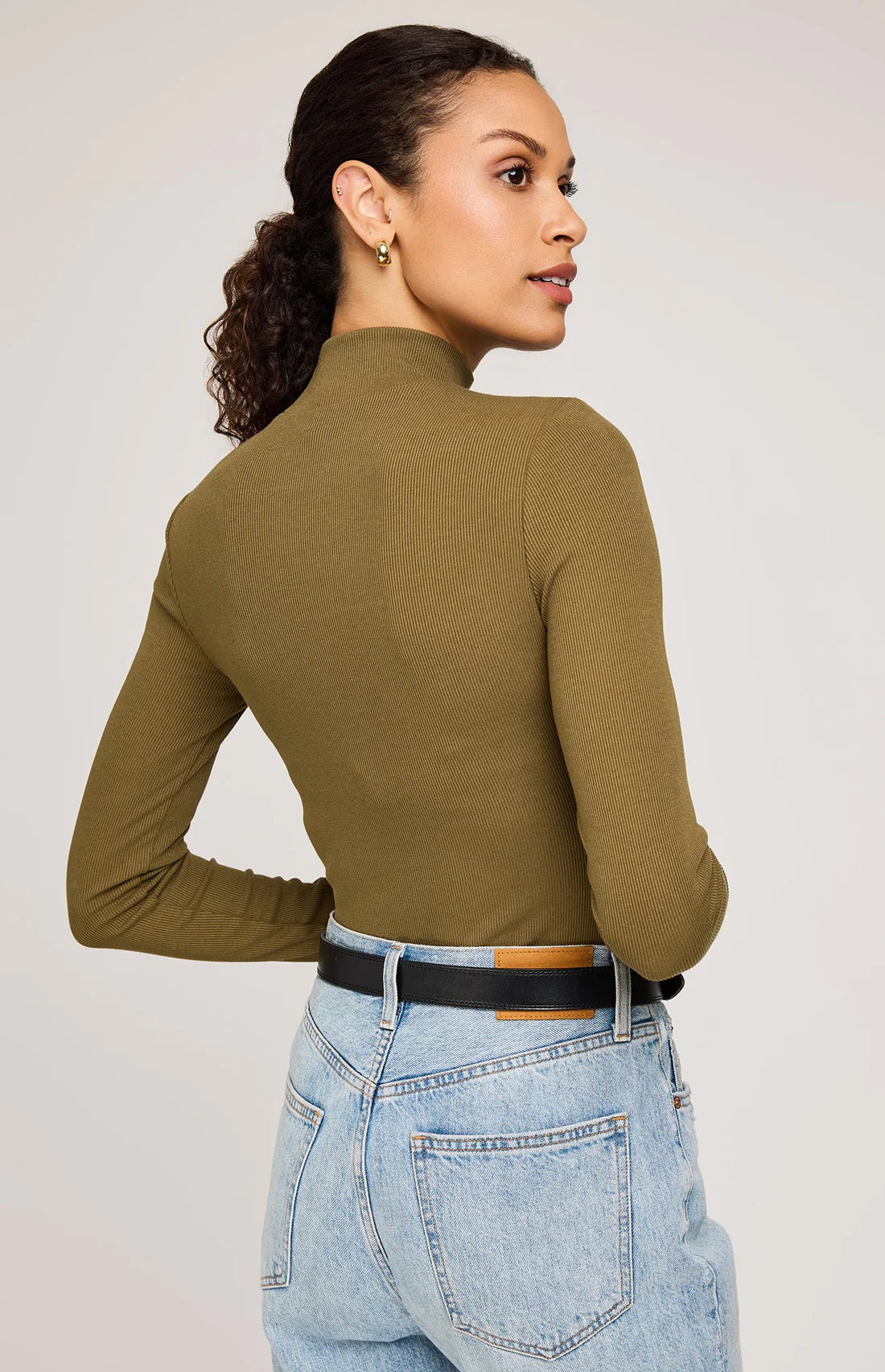 The Wren top is made of a stretchy ribbed fabric that hugs the body. The effortless silhouette can be worn as is or tucked into high-waisted bottoms.