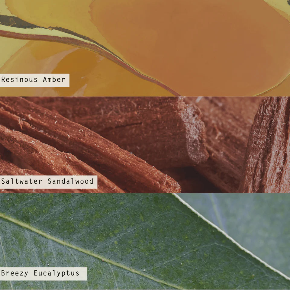 Grounded in resinous amber, with a heart of saltwater sandalwood, and kissed with breezy eucalyptus.